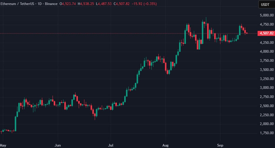 Отметим, на момент написания Ethereum торгуется выше отметки в $4500: