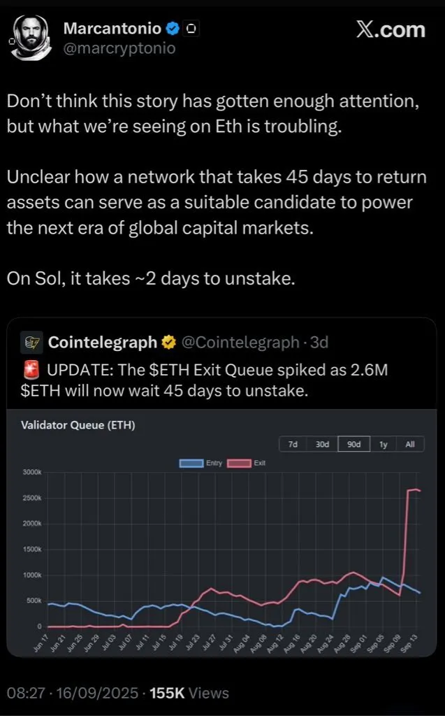 Он сравнил Ethereum с Solana, где для вывода требуется всего два дня.