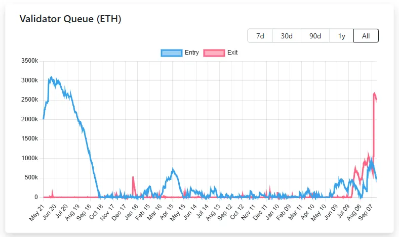 По состоянию на 18 сентября снятия ожидают 2,49 млн ETH, полная разблокировка этого объема займет более 43 дней.
