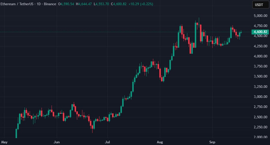 Отметим, на момент написания Ethereum торгуется вблизи отметки $4600: