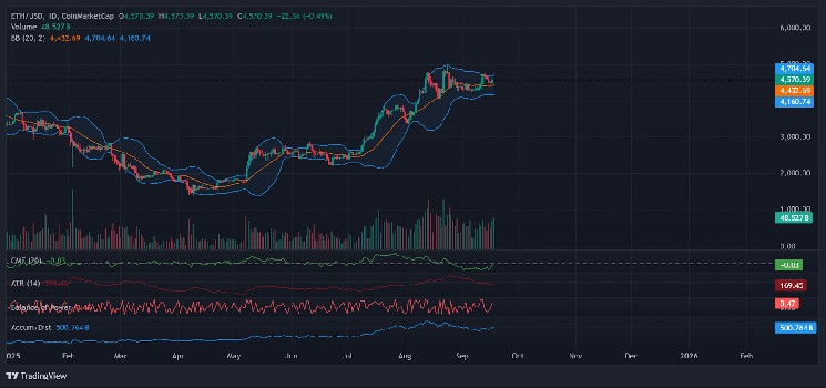 На дневном графике курс ETH колеблется между уровнем поддержки $4432 (средняя полоса Боллинджера) и уровнем сопротивления $4704 (верхняя полоса). Чистый прорыв уровня $4704 может создать условия для роста к $4800 и, возможно, повторного тестирования $4900 при увеличении объёма торгов.