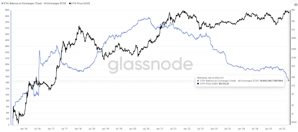 По данным Glassnode, на централизованных площадках осталось 14,8 млн ETH.