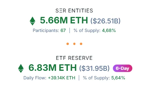 Основная доля приходится на спотовые Ethereum-ETF — 6,83 млн ETH (5,64%). Корпоративные резервы составляют 5,66 млн ETH (4,68%).