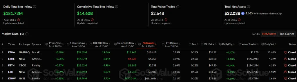 Данные SoSoValue подтверждают тенденцию. 6 октября Ethereum-ETF привлекли $181,73 млн, показав положительную динамику шестой день подряд.