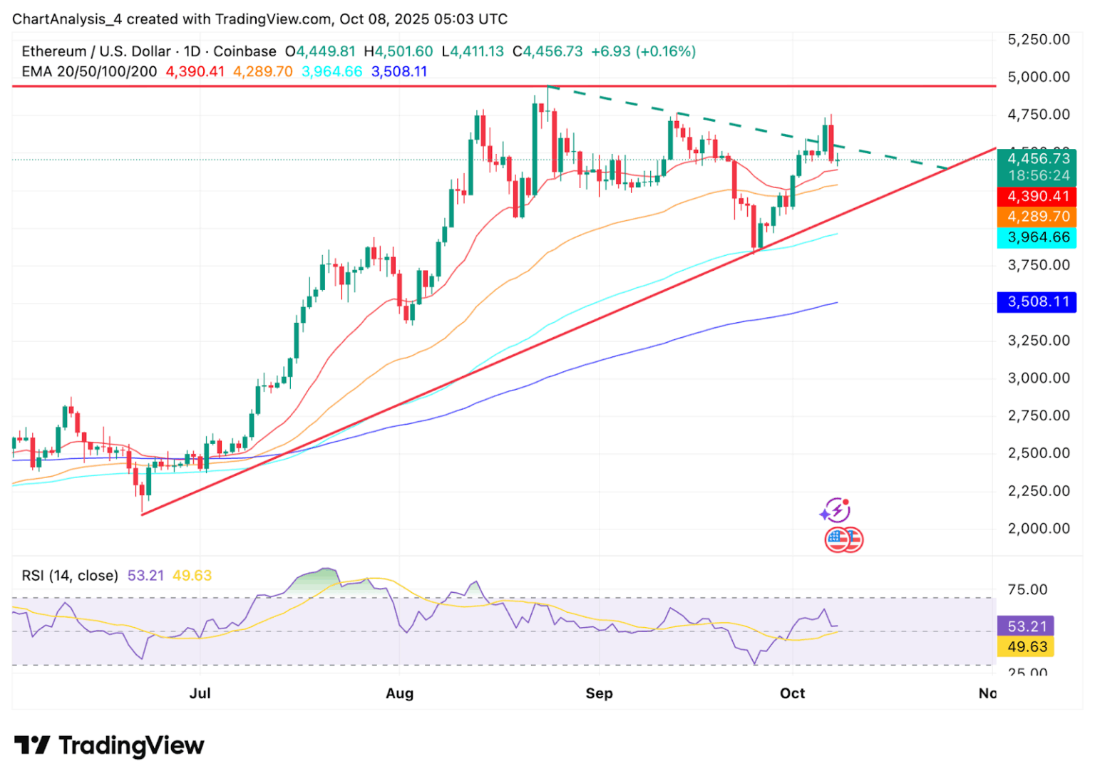 Цена Ethereum (CRYPTO: ETH) сегодня торгуется вблизи $4 456, консолидируясь чуть ниже критической нисходящей линии тренда, которая ограничивала попытки роста с августа. Рынок держится выше краткосрочных поддержек, а покупатели защищают зону $4 390–$4 290, где сходятся 20-дневная и 50-дневная EMA.