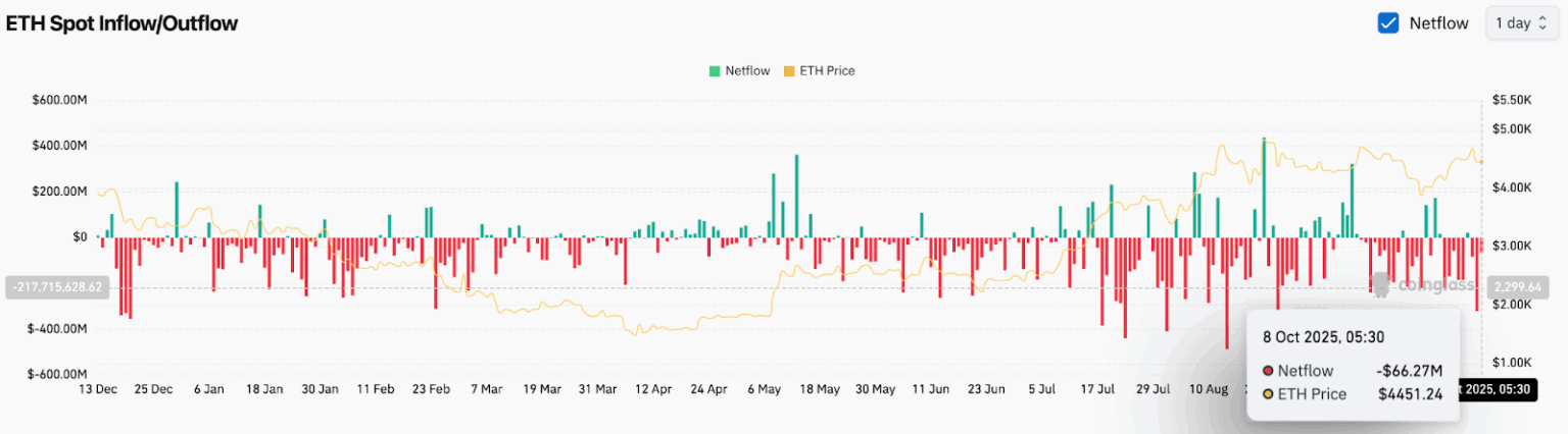 По данным Coinglass, 8 октября Ethereum зафиксировал чистый отток в размере $66 млн, что указывает на умеренную фиксацию прибыли после ралли на прошлой неделе. В то время как краткосрочный отток часто охлаждает перегретое ценовое действие, устойчивая слабость валютных балансов исторически предшествовала консолидации в середине цикла.