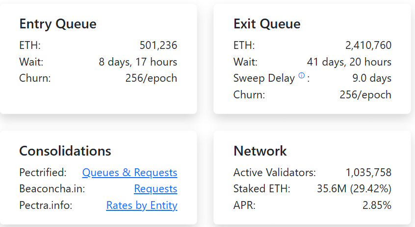 В среду очередь на вывод из стекинга превысила 2,4 млн ETH на сумму более $10 млрд. Согласно данным ValidatorQueue.com, из-за резкого роста числа заявок время ожидания вывода валидаторов превысило 41 день.