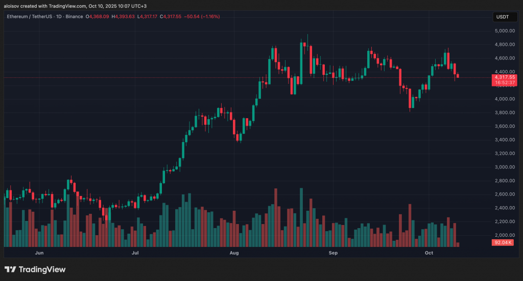7 октября Ethereum поднялся до недельного максимума $4 755, но затем показал слабость. 9 октября цена ненадолго опустилась до $4 265. Актив демонстрирует боковое движение в диапазоне, который сформировался после первого пробоя отметки $4 000 в начале августа этого года.