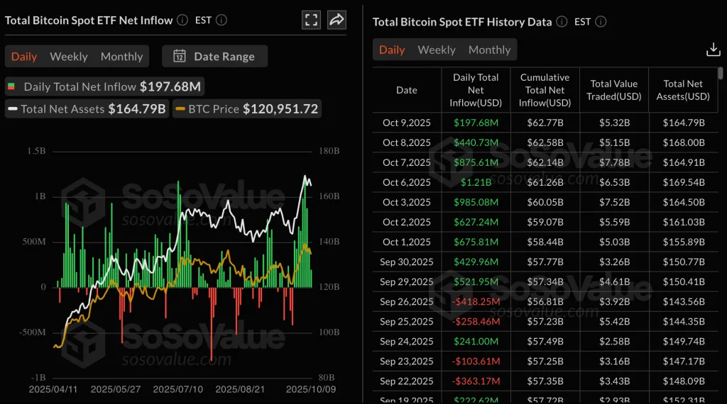 Спотовые биткоин-ETF продолжили девятидневную серию притока. За сутки ориентированные на цифровое золото фонды привлекли $197,8 млн. С начала октября в них поступило $5 млрд против $1,2 млрд у Ethereum-продуктов.