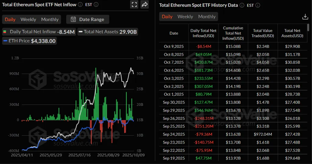 10 октября инвесторы вывели из Ethereum-ETF около $8,7 млн, что прервало восьмидневный приток средств на $1,97 млрд. Об этом свидетельствуют данные SoSoValue.