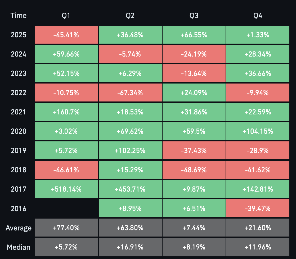 1 октября начался четвертый квартал — период, который приносил Ethereum среднюю доходность в 21,6% с 2016 года, согласно данным CoinGlass.