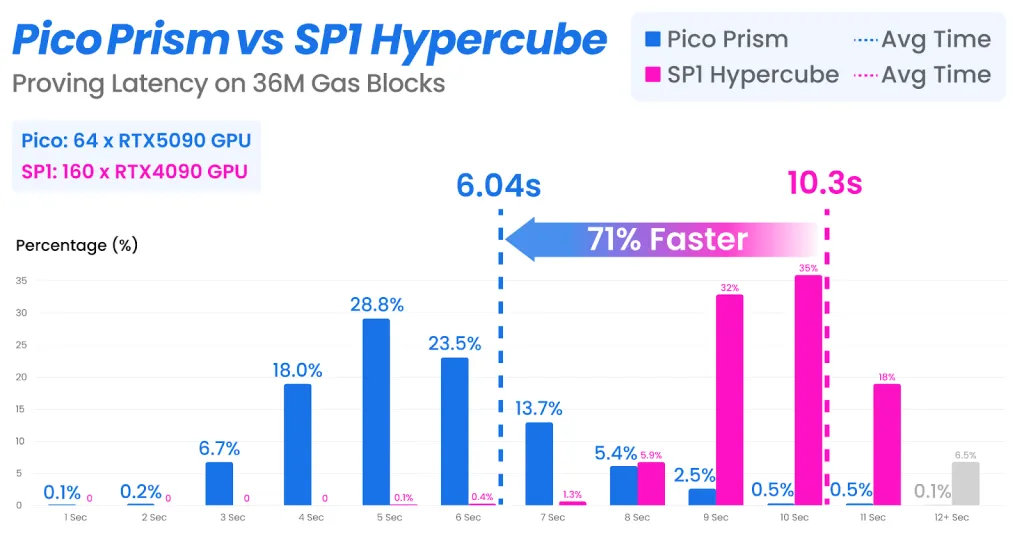 В одном из тестов Pico Prism проверила 99,6% блоков менее чем за 12 секунд. 96,8% уложились в стандарт Ethereum Foundation — 10 секунд. Среднее время доказательства составило 6,9 секунды для блоков с лимитом газа в 45 млн единиц.