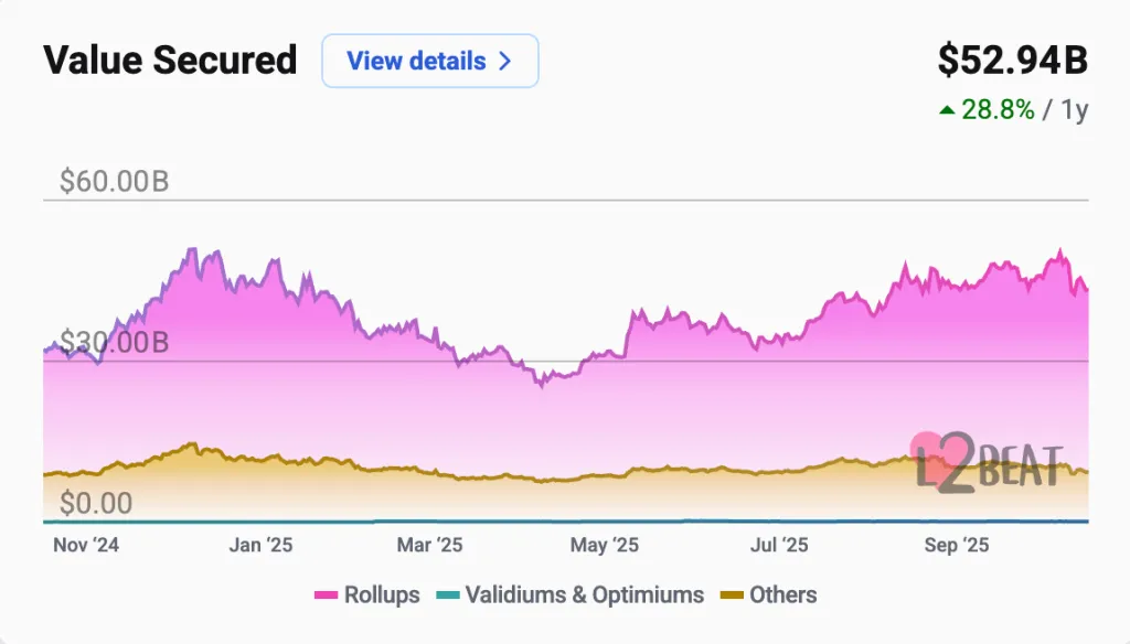 Согласно L2Beat, в сетях второго уровня заблокировано более $52,94 млрд. За последний год показатель вырос на 28,8%.