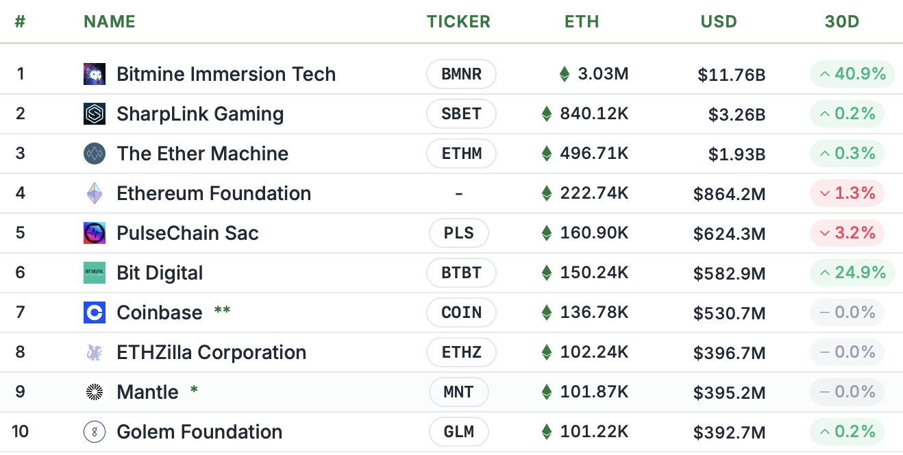 BitMine уже является крупнейшей в мире компанией по объему резервов Ethereum — у нее накоплено более 3 млн ETH, что составляет 2,5% от общего предложения монет стоимостью $11,7 млрд. Компания находится на полпути к своей цели — 5% от всего предложения Ethereum. При этом накапливать актив она начала только в начале июля, когда ETH торговался около отметки $2 500.