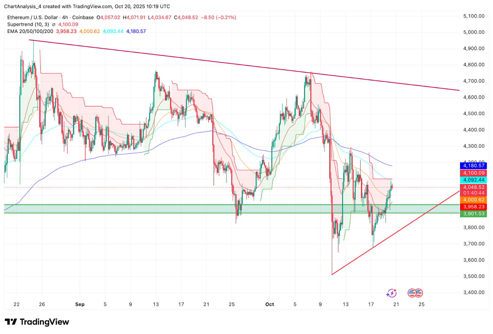 В течение октября цена ETH была нестабильной: резкие распродажи с пробитием основных скользящих средних, прежде чем покупатели стабилизировали рынок. Диапазон $3900–$4000 неоднократно служил зоной спроса, чему способствовал кластер 100-дневных EMA.