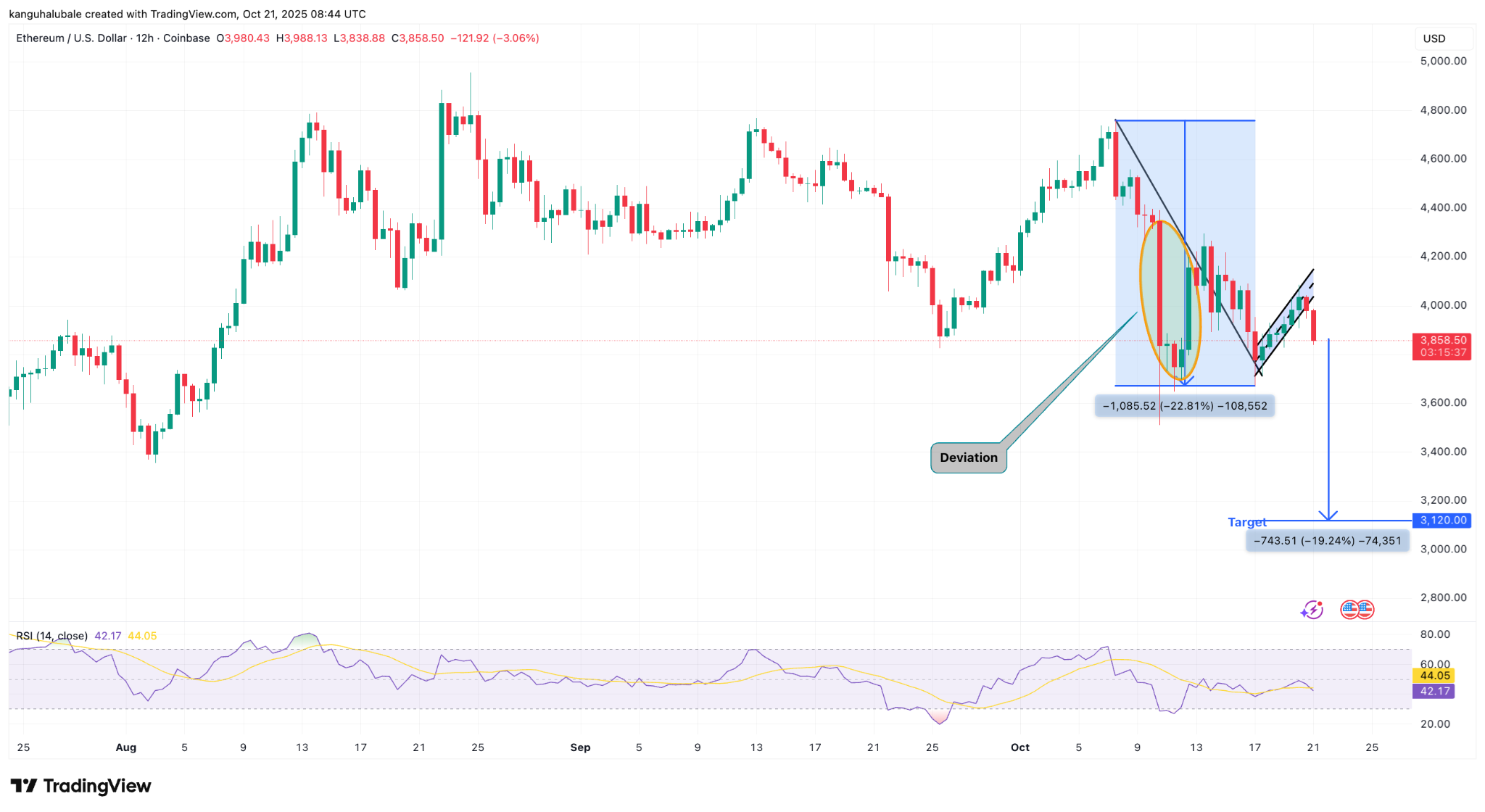 21 октября курс пробил нижнюю границу модели у ~$4000, что сигнализирует о начале реализации сценария. Расчетная цель, исходя из высоты флагштока, составляет ~$3120, что предполагает падение на ~20% от текущих значений.
