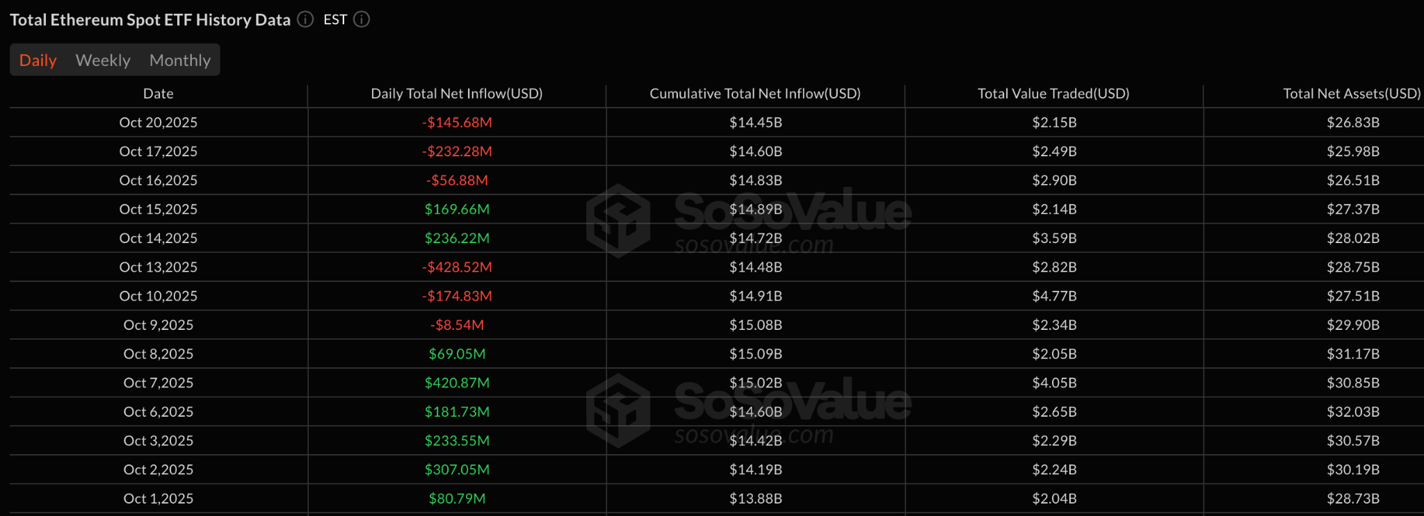 Притоки в биржевые фонды (ETF) на базе второй по капитализации криптовалюты приостановились. Согласно SoSoValue, 20 октября клиенты вывели из продуктов $145,7 млн. Негативная динамика продолжилась третий день подряд.