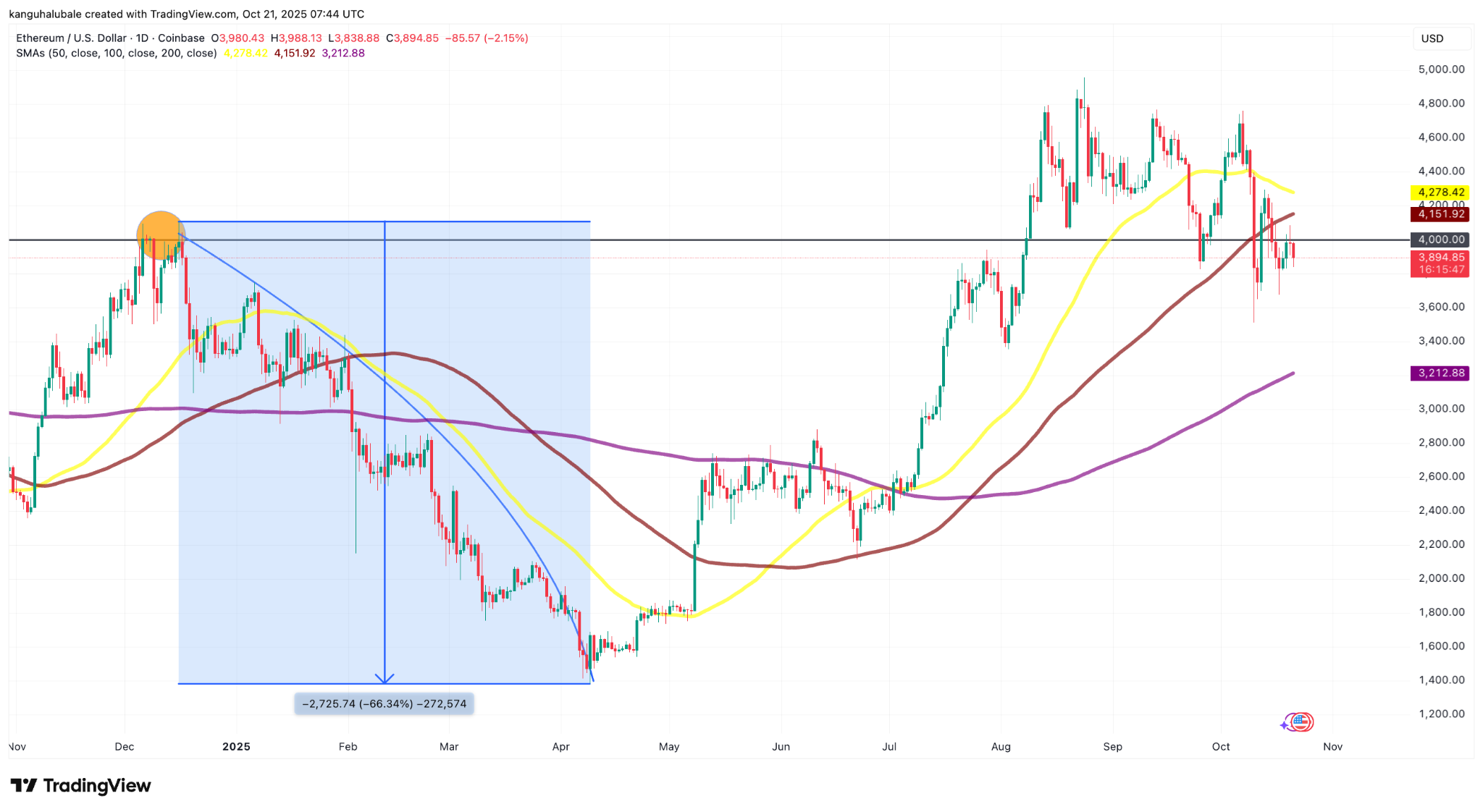 Аналитик под ником Daan Crypto Trades отметил, что в декабре 2024 года область выше $4000 выступила «потолком» для аптренда, что подчеркивает ее «критический характер в краткосрочной/среднесрочной перспективе». В последующие месяцы монета подешевела на 66%.