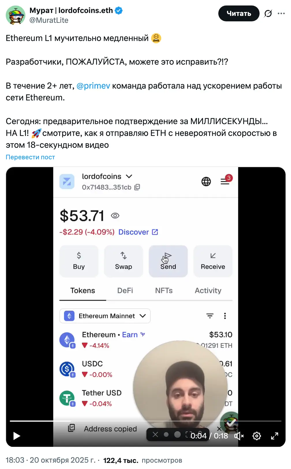 Основатель Primev Мурат Акдениз опубликовал в понедельник живую демонстрацию в X, показав практически мгновенный перевод ETH через кошелек MetaMask. По его словам, перевод был предварительно подтвержден за 377 мс и включен в тот же блок.