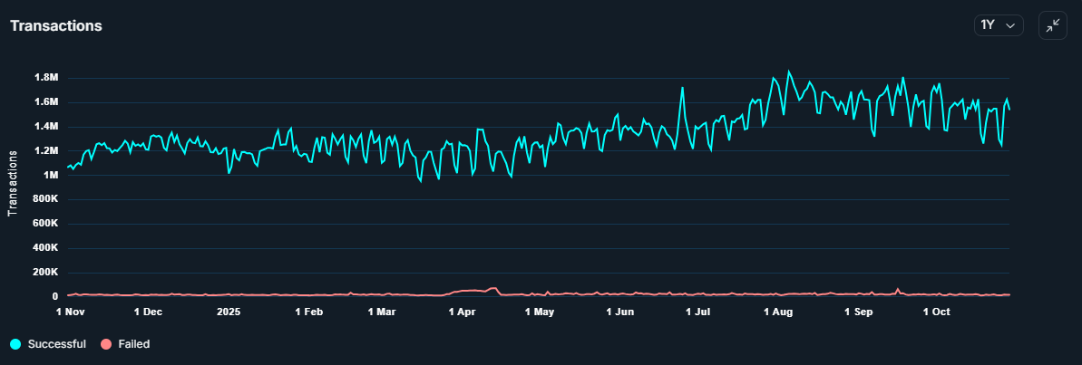 Количество ежедневных транзакций в сети выросло до 1,6 млн во вторник, достигнув почти месячного максимума. Последний раз такие значения наблюдались в начале октября до рекордного события ликвидаций на $19 млрд.
