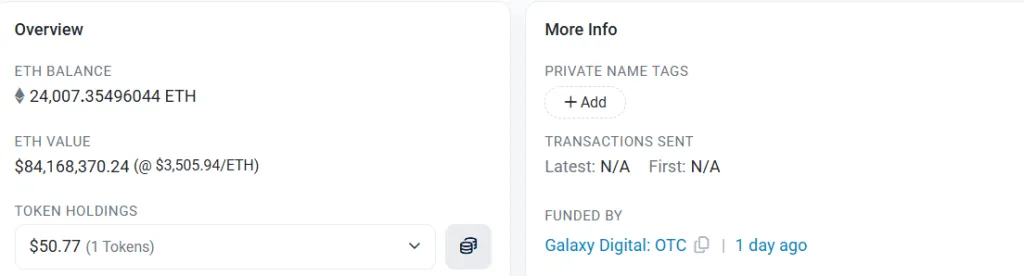 По данным Etherscan, другой кит приобрел 24 007 ETH на $84 млн через внебиржевую платформу Galaxy Digital.