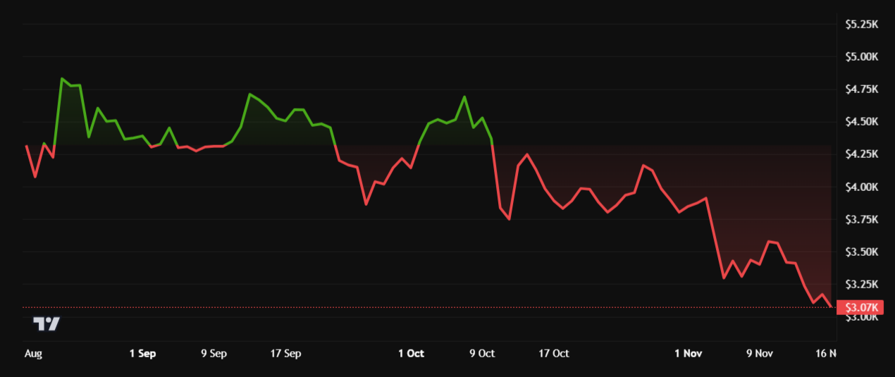 Цена эфира упала ниже 3100 долларов впервые с 4 ноября 2025 года. По состоянию на 21:36 по всемирному координированному времени 16 ноября эфир торговался по цене 3066 долларов, снизившись на 3,4 % за 24 часа. Это снижение отражает общую слабость цифровых активов и мнение о том, что ETH более рискован, чем биткоин.