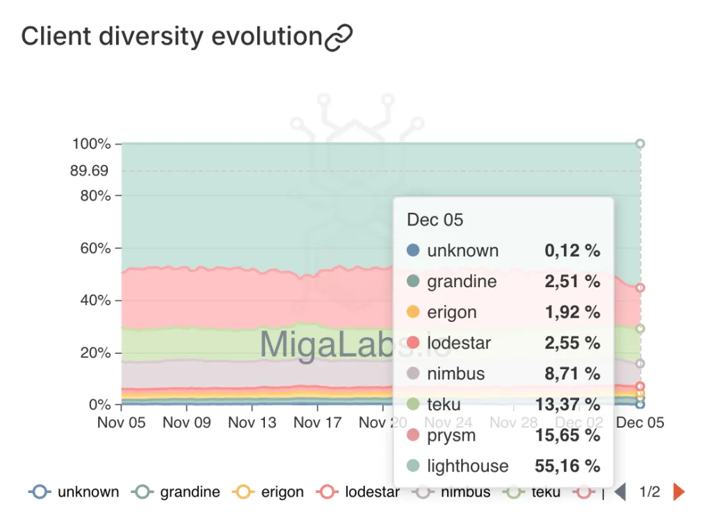 Несмотря на некоторый прогресс, Ethereum пока далек от безопасного распределения клиентов. Критически важным считается порог в 33% для одного клиента. Сейчас среди них доминирует Lighthouse с долей 52,55%.