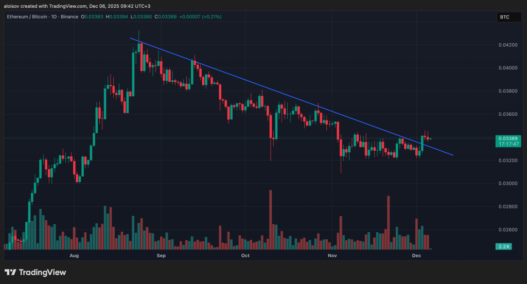 Динамика цены Ethereum относительно биткоина привлекла внимание и других участников криптосообщества на этой неделе. Юрист по цифровым активам Джо Карласаре (Joe Carlasare) отметил, что ETH/BTC пробил нисходящий тренд, длившийся почти полгода.
