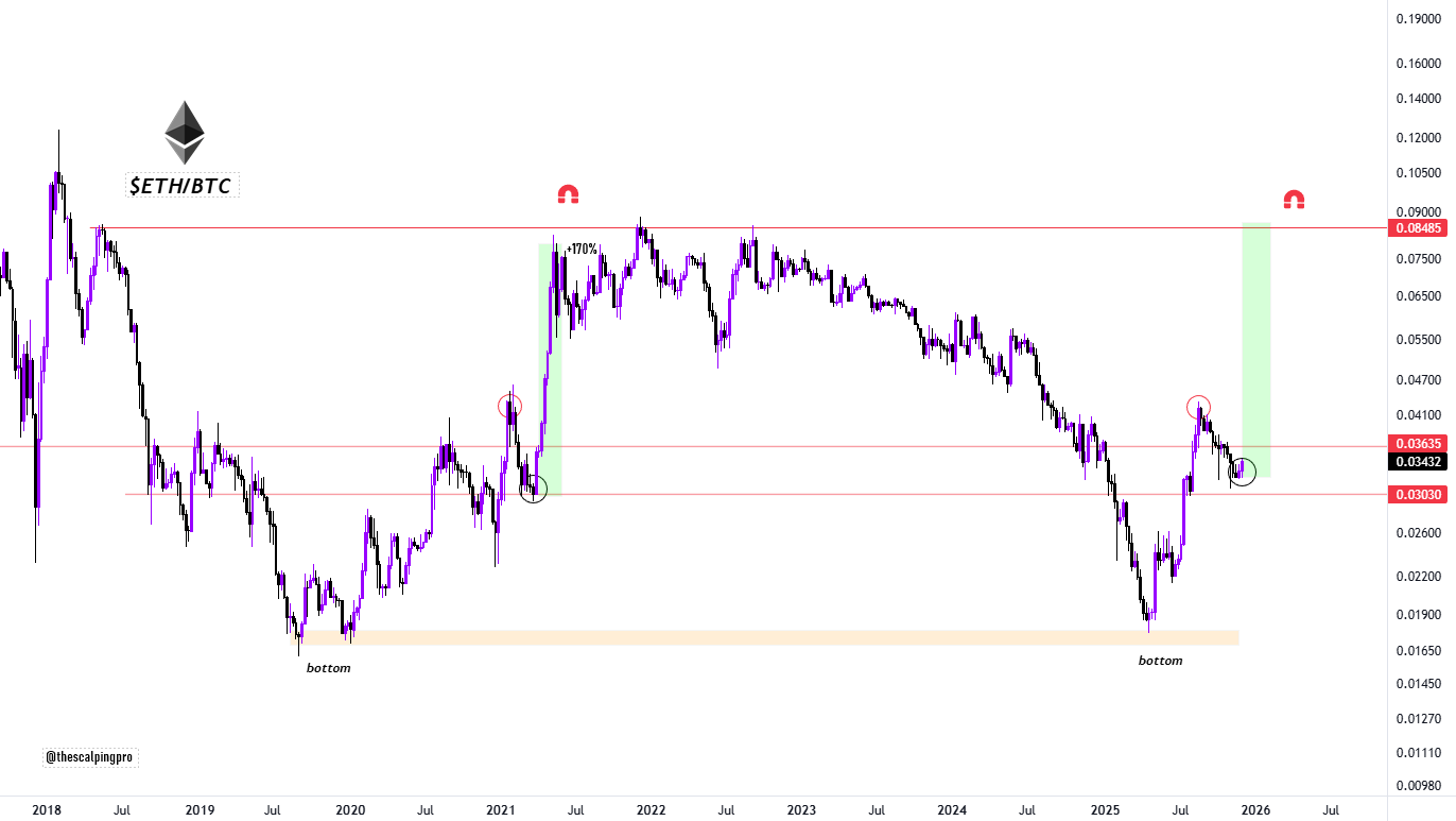 Ethereum годами снижался в торговой паре с биткоином, но последние несколько месяцев придали этой динамике явно бычий характер. Как отмечает Mags, актив ETH/BTC достиг дна, точно коснувшись того же минимума, который заложил основу для предыдущего бычьего рывка.