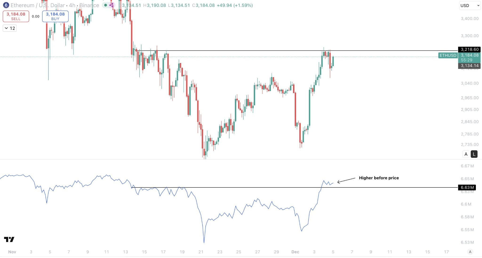 5 декабря эксперт под ником Sykodelic написал, что произошел пробой сопротивления по индикатору On-Balance Volume (OBV) — это метрика импульса, основанная на объеме торгов.