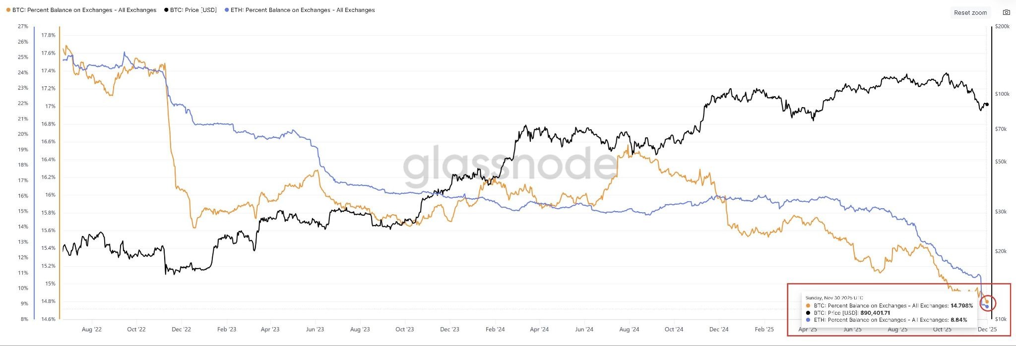 4 декабря балансы эфира на площадках упали до 8,7% — это самый низкий показатель с момента запуска блокчейна в середине 2015 года. Утром 7 декабря значение немного выросло — до 8,8%, по данным Glassnode.