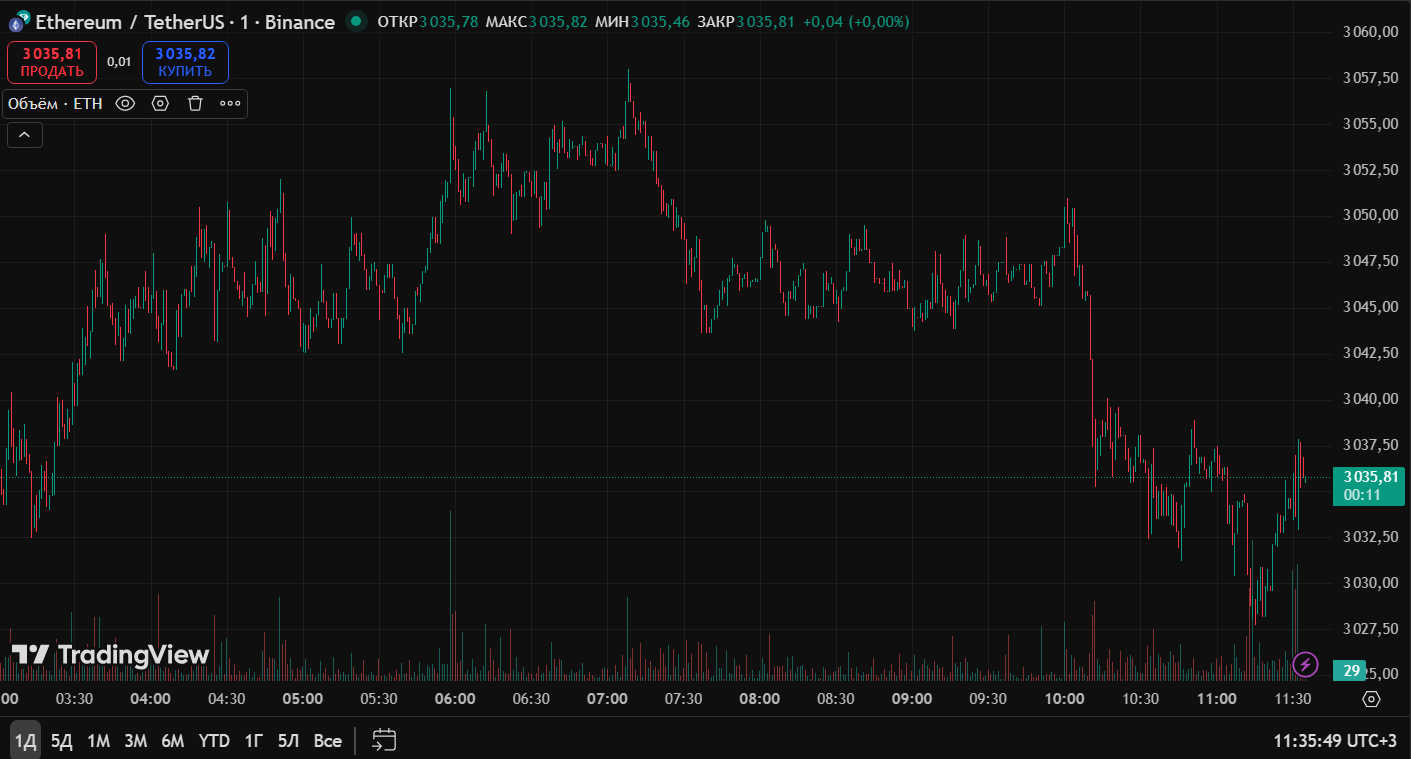 На момент написания Ethereum (ETH) продолжает консолидироваться в районе $3050. За последние 24 часа токен не показал никакой ярко выраженной динамики.