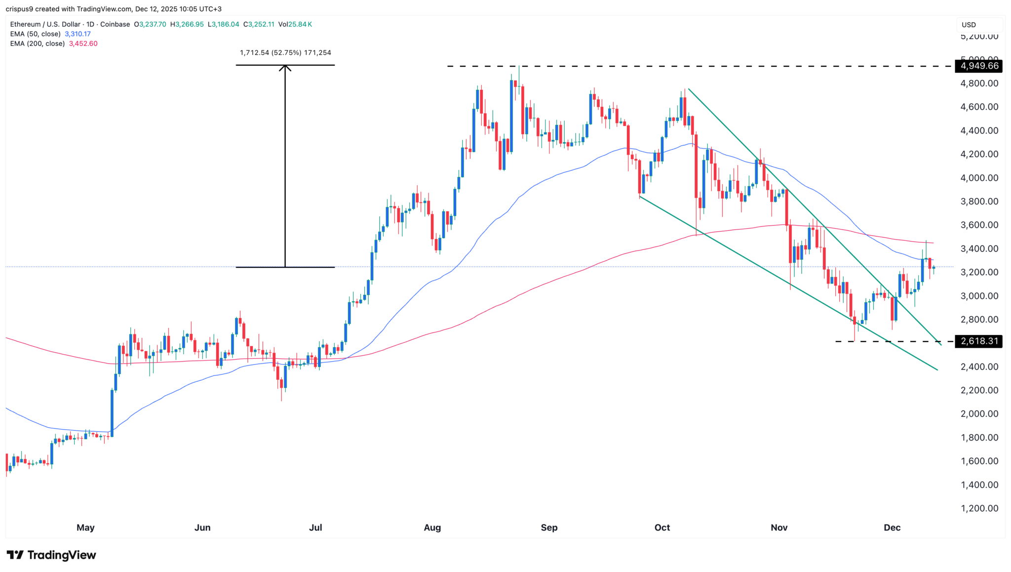 Первый главный бычий фактор для Ether — это сильные технические показатели. Дневной график показывает, что токен отскочил от ноябрьского минимума в $2618 до текущего уровня в $3260.