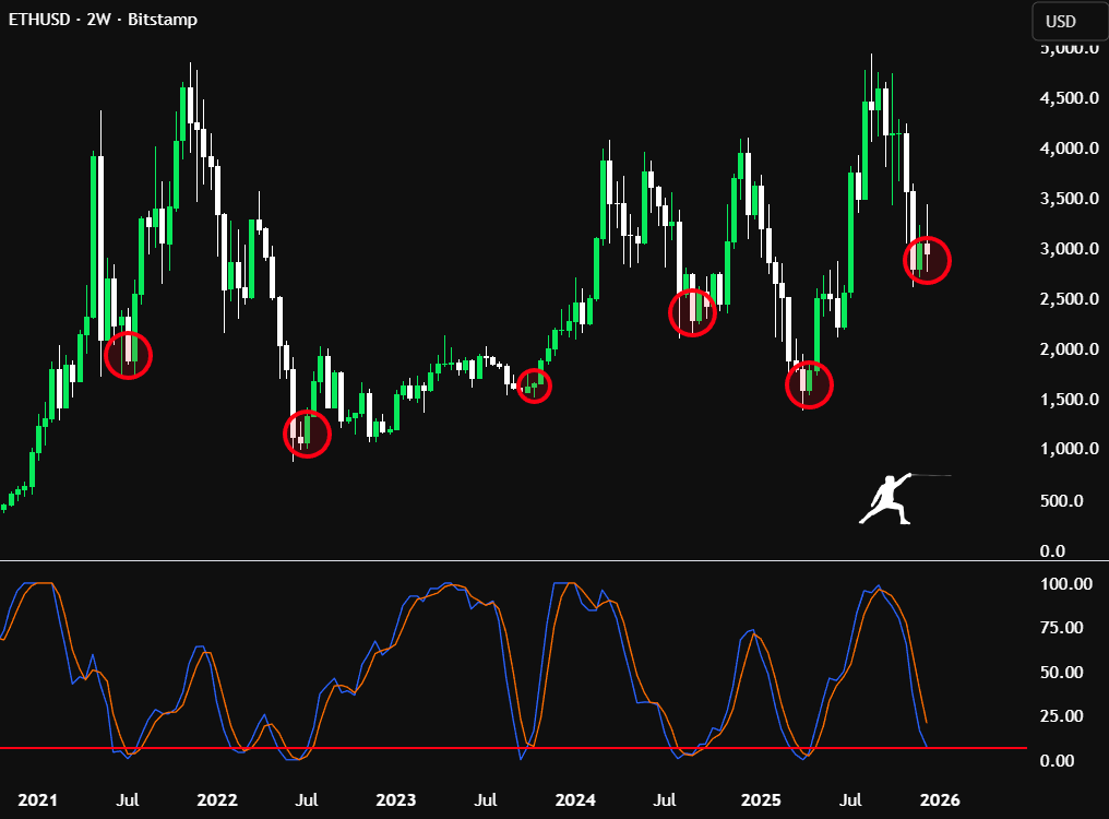 Эту точку зрения поддерживает Rekt Fencer. Он отметил, что текущий уровень для ETH исторически является зоной, где формируются долгосрочные минимумы.