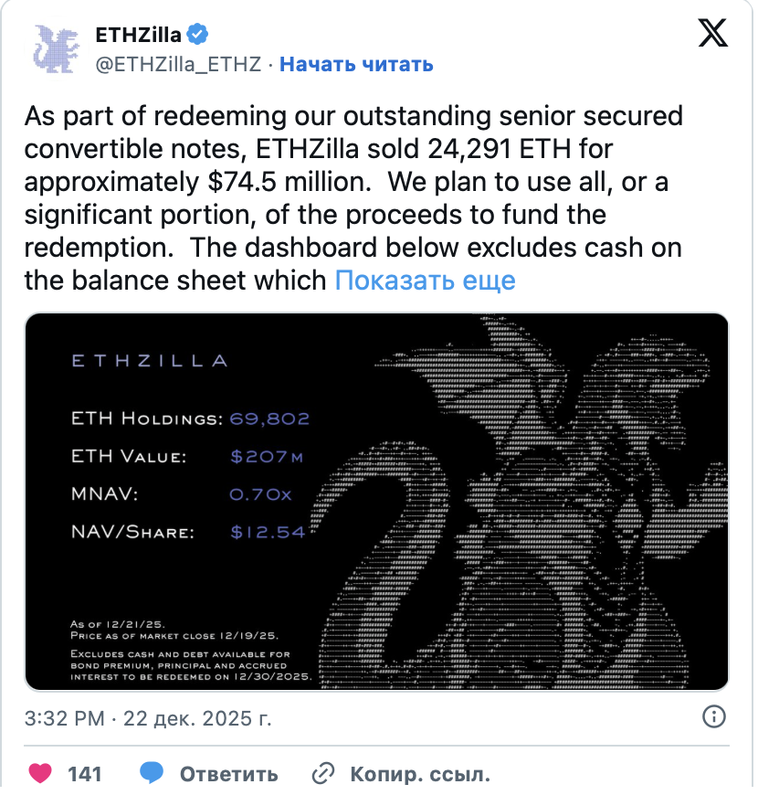 Компания ETHZilla, входящая в пятерку крупнейших владельцев Ethereum среди публичных фирм, продала значительную часть своих криптовалютных резервов. Данное событие спровоцировало дискуссию о настроениях крупных игроков.