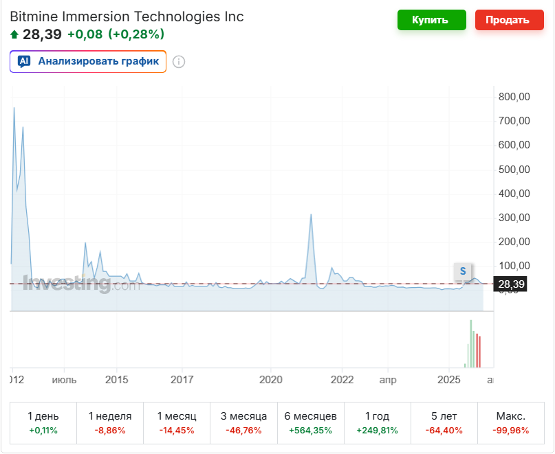 Акции компании — BMNR — демонстрируют высокую ликвидность: в среднем дневной объем торгов составляет около $980 млн, что ставит компанию на 47-е место среди всех акций, котирующихся в США.