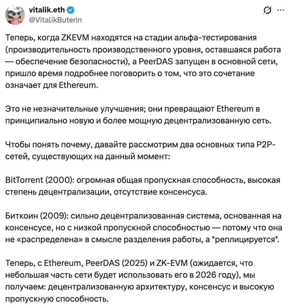 Виталик Бутерин в публикации на X подчеркнул потенциал выборки доступности данных (PeerDAS) и виртуальных машин Ethereum с нулевым разглашением (zkEVM). Он отметил, что эти обновления превращают Ethereum в «принципиально новый и более мощный тип децентрализованной сети».