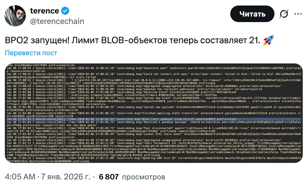 В среду вступил в силу второй хардфорк типа Blob Parameter‑Only (BPO). Он поднял лимит blob‑данных с 15 до 21. Кроме того, целевое значение blob увеличено с 10 до 14. Последнее считается более важным показателем: если сеть регулярно будет приближаться к лимиту в 21 blob, это может перегрузить пропускную способность и хранилище узлов.