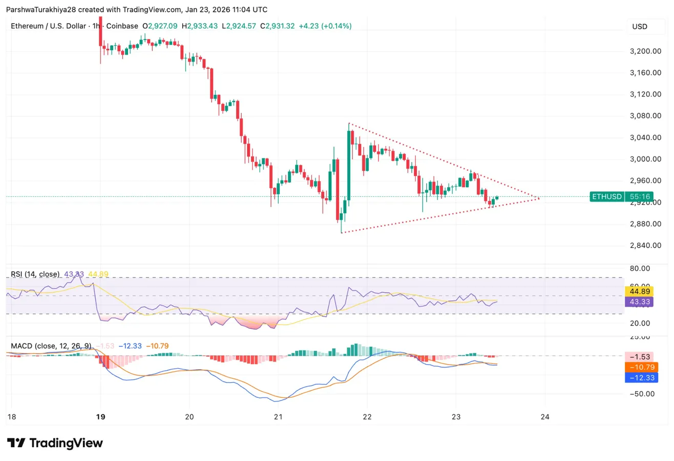 Более короткие сроки показывают краткосрочное давление. На часовом графике ETH сформировал нисходящий треугольник с момента распродажи 19 января. Цена снижает максимумы, в то время как поддержка остаётся на уровне 2 920 долларов.