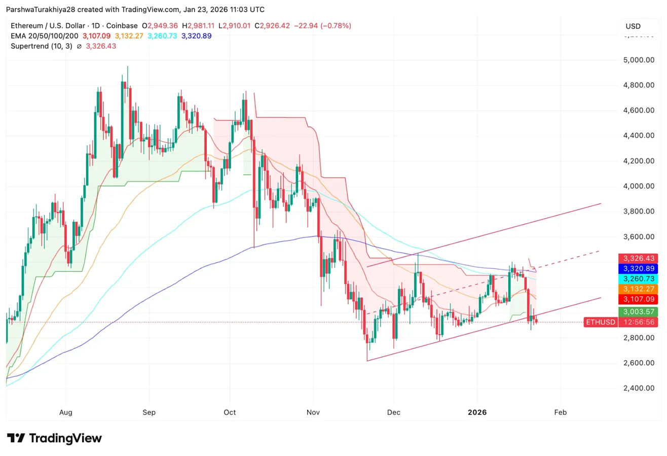 На дневном графике Ethereum торгуется внутри восходящего канала с декабря минимума около $2,600. Закономерность показывает более высокие минимумы, при этом цена в третий раз за месяц тестирует нижнюю границу.