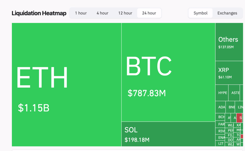 Основной удар пришелся на Ethereum: за последние 24 часа было ликвидировано позиций по $ETH на сумму более 1 150 000 000 долларов. Согласно данным карты ликвидаций, биткоин потерял примерно 788 000 000 долларов, а Solana - около 200 000 000 долларов.