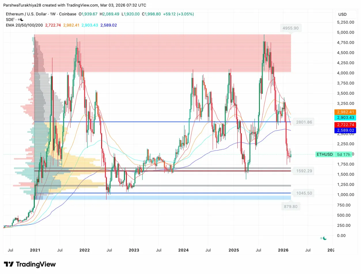 Недельный график показывает, как Ethereum пробивается выше уровня $1,920 после многомесячной консолидации в зоне с высоким объёмом (синяя затемнение) между $1,045 и $2,801. Профиль объемов слева показывает, что этот диапазон отражал наибольшее количество цен за последние два года.