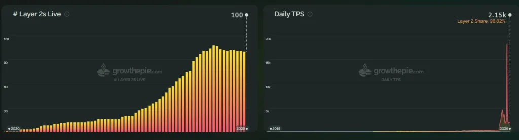 С июня 2025 года количество Ethereum-решений второго уровня с TVS более $100 000 уменьшилось с 108 до 100, учитывая запуски новых протоколов. На это обратили внимание исследователи growthepie.