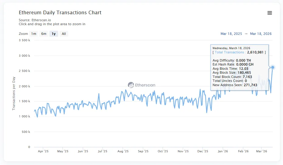 Общие показатели Ethereum демонстрируют постановление ончейн-активности после спада прошлой осенью. 18 марта суточное число транзакций в блокчейне достигло 2,6 млн.