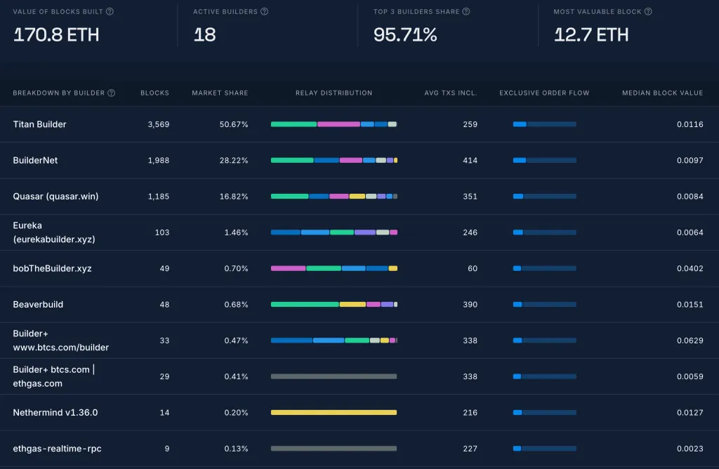 Согласно данным Rated Network, проект начал работу в декабре 2024 года и уже стал четвертым по величине Ethereum-билдером по количеству созданных блоков. Однако рыночная доля компании пока находится на скромном уровне в 1,5%, тогда как почти 96% сегмента контролируют лидеры ниши: Titan Builder, BuilderNet и Quasar Builder.