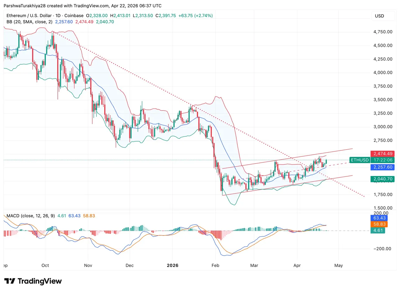 $ETH торгуется на уровне $2,391 22 апреля, вырос на 2,74%, поднимая верхнюю зону Боллингера на уровне $2,474, поскольку MACD впервые с февраля становится положительным, приток ETF достиг девятого дня подряд, а Etherealize публикует долгосрочную цель цены $250,000, называя $ETH лучшей валютой, чем биткоин.