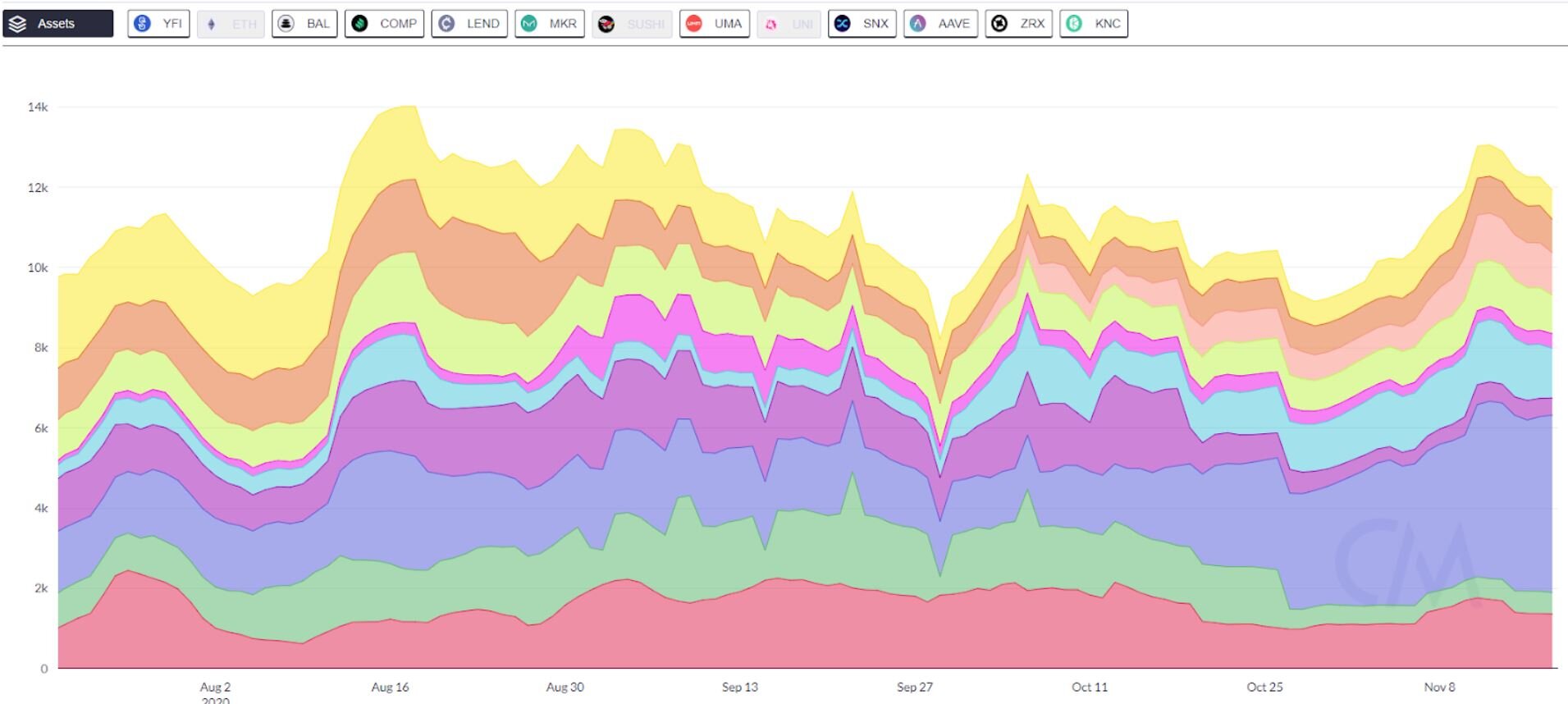 Активность адресов на рынке DeFi (в статистике не учтены данные протоколов Sushi и Uni). Источник: Coinmetrics