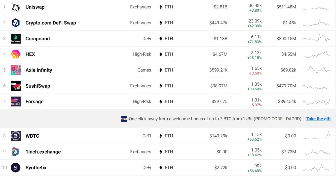 Всплеск интереса к приложениям может быть связан с притоком юзеров на рынок децентрализованных финансов.