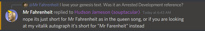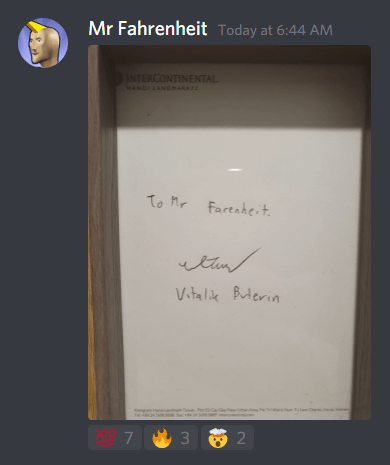 В Дискорде мистер Фаренгейт спрашивал у других разработчиков Эфириума, что именно ему следует написать в первом блоке. Изначально он хотел сравнить Биткоин с «печатной машинкой», но потом было принято более консервативное решение.