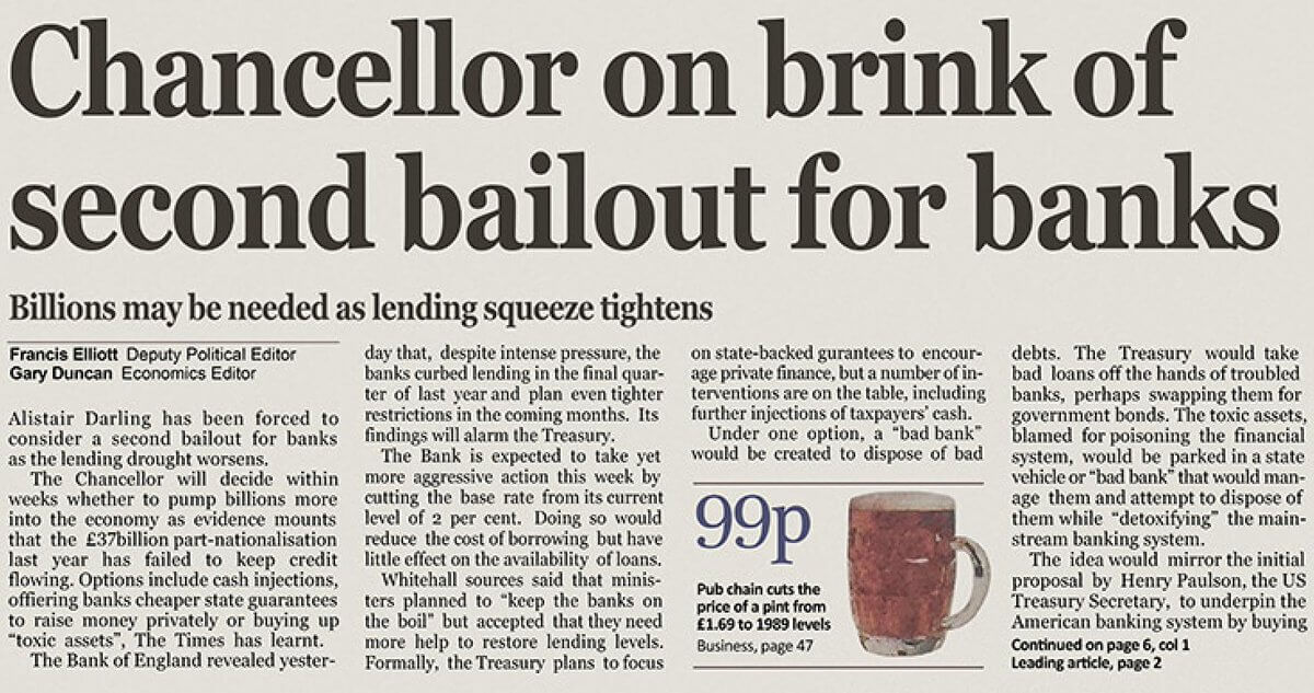 Тот самый заголовок: «Chancellor on brink of second bailout for banks»